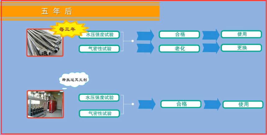 2、五年后,對釋放過滅火劑的儲瓶、相關(guān)閥門等部件進(jìn)行一次水壓強(qiáng)度和氣體密封性試驗(yàn),試驗(yàn)合格方可繼續(xù)使用。