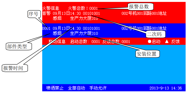 控制器經(jīng)確認(rèn)后進(jìn)入火災(zāi)報(bào)警狀態(tài)并發(fā)出火警聲、光警報(bào)。此時(shí)面板上紅色火警指示燈常亮,液晶屏上顯示火警序號(hào)、火警總數(shù)、首警部位、報(bào)警部件的編碼及類型、報(bào)警時(shí)間、安裝位置等信息(詳見(jiàn)圖上半屏顯示),同時(shí)打印機(jī)、歷史記錄記錄相關(guān)火警信息。當(dāng)火警數(shù)量超過(guò)兩條顯示時(shí),除首警外,其余報(bào)警可自動(dòng)循環(huán)顯示,按鍵盤(pán)上的“▲”、“▼”鍵也可手動(dòng)查詢。