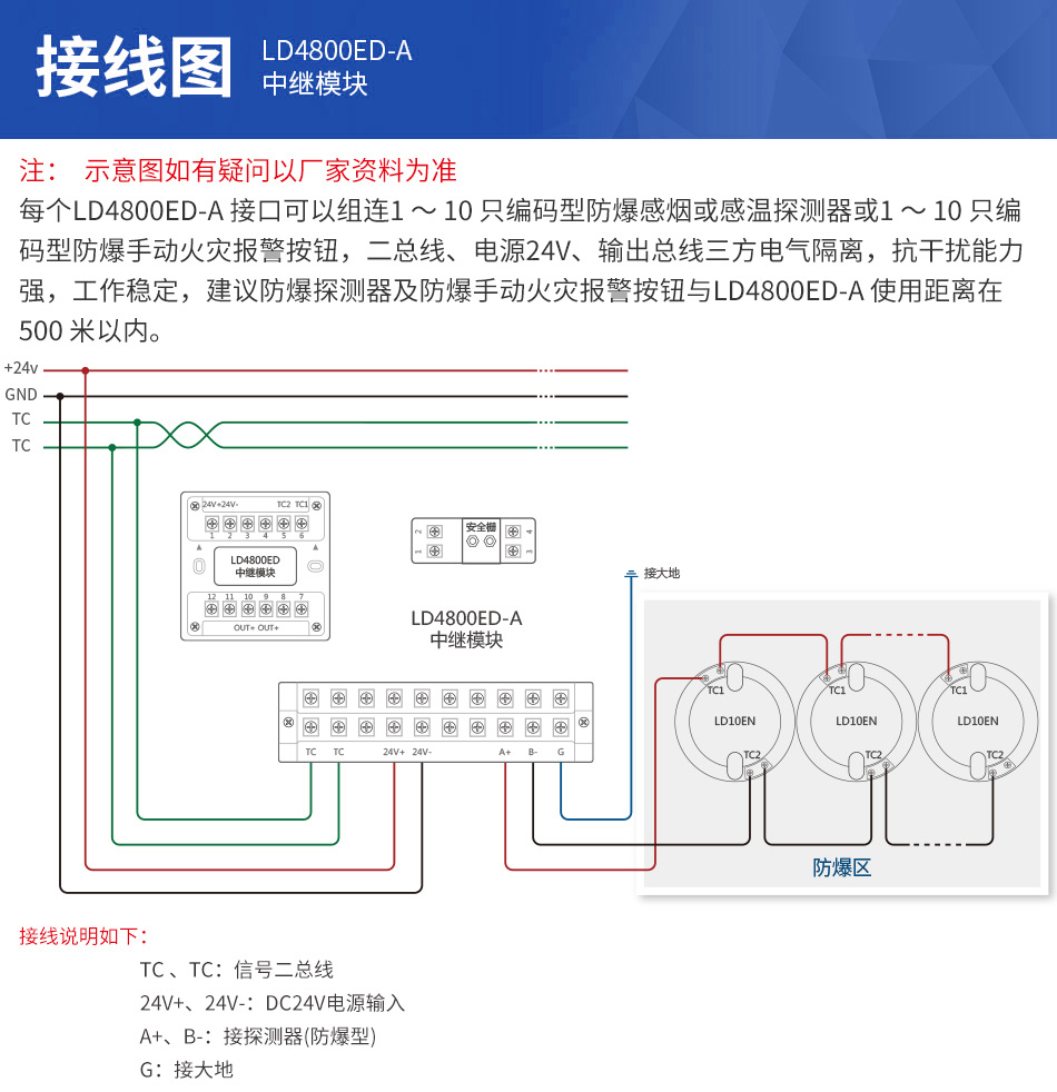 1、每個(gè)LD4800ED-A接口可以組連1~10只編碼型防爆感煙或感溫探測器或1~10只編碼型防爆手動火災(zāi)報(bào)警按鈕。