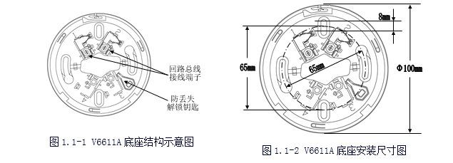 V6611A探測器底座結(jié)構(gòu)簡單、安裝方便、結(jié)構(gòu)件配合牢固;具有探測器防丟失結(jié)構(gòu)設(shè)計,每只底座均備有專用的解鎖鑰匙。底座備有長圓形安裝定位孔,可適應于86H50型標準預埋盒及其它型號的預埋盒。