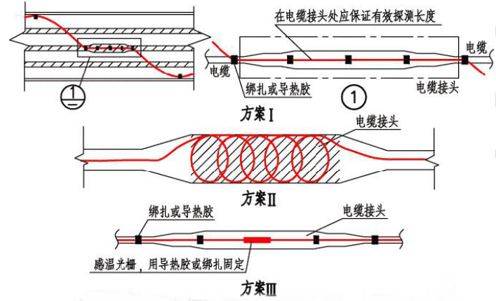 線(xiàn)型感溫火災(zāi)探測(cè)器應(yīng)采用接觸式的敷設(shè)方式對(duì)隧道內(nèi)的所有的動(dòng)力電纜進(jìn)行探測(cè);分布式線(xiàn)型光纖感溫火災(zāi)探測(cè)器在電纜接頭、端子等發(fā)熱部位敷設(shè)時(shí),其感溫光纜的延展長(zhǎng)度不應(yīng)少于探測(cè)單元長(zhǎng)度的1.5 倍,在電纜接頭處應(yīng)采用方案Ⅱ的方式;光纖光柵線(xiàn)型感溫火災(zāi)探測(cè)器在電纜接頭、端子等發(fā)熱部位應(yīng)設(shè)置感溫光柵單元,應(yīng)才用方案Ⅰ、Ⅲ的方式。如圖6 所示: