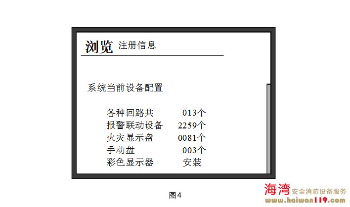完成以上操作后,系統(tǒng)上電進(jìn)行初始化(畫面顯示如圖1所示)。初始化完成后進(jìn)入對(duì)運(yùn)行記錄、隔離信息、聯(lián)動(dòng)公式、聲光電源的自動(dòng)檢查狀態(tài)(畫面顯示如圖2所示),自檢完畢,控制器對(duì)外接火災(zāi)顯示盤、探測(cè)器和模塊進(jìn)行注冊(cè)(如圖3所示),并顯示注冊(cè)信息 (如圖4所示) 。至此,開機(jī)過(guò)程結(jié)束,系統(tǒng)進(jìn)入正常監(jiān)控狀態(tài)。主機(jī)鍵盤上設(shè)有“自檢”鍵,按下此鍵后系統(tǒng)將進(jìn)行和開機(jī)時(shí)相同的聲光及電源檢查。 關(guān)機(jī)過(guò)程按照與開機(jī)時(shí)相反的順序關(guān)掉各開關(guān)即可。要注意各個(gè)備電開關(guān)一定要關(guān)掉,否則,將有損壞電池的可能。