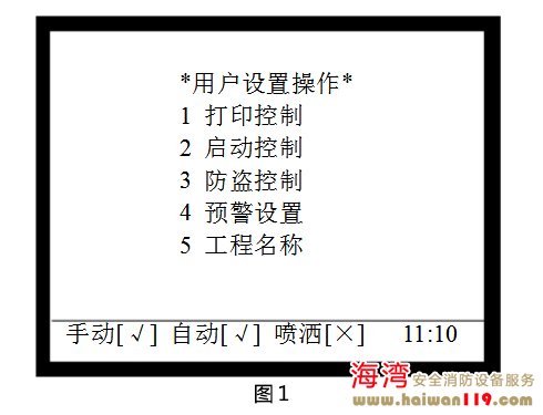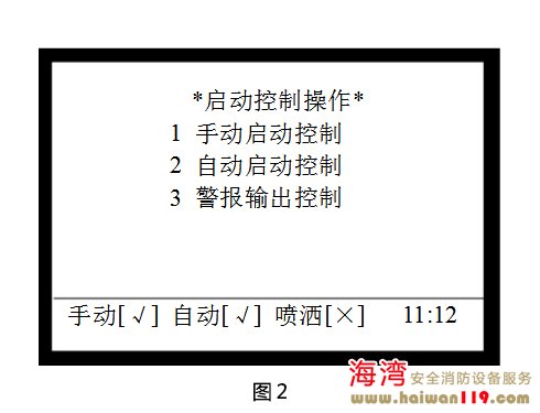 啟動(dòng)控制設(shè)置 在圖1所示界面下,按2進(jìn)入“啟動(dòng)控制”界面,調(diào)出啟動(dòng)控制操作菜單,如圖2所示,包含手動(dòng)啟動(dòng)控制、自動(dòng)啟動(dòng)控制、警報(bào)輸出控制的設(shè)置,可通過按下其對應(yīng)的數(shù)字鍵進(jìn)行相關(guān)的設(shè)置