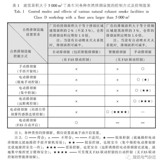 為方便理解和分析,下面以建筑面積大于5000m2丁類車間應(yīng)設(shè)排煙設(shè)施(以自然排煙設(shè)施)舉例,將設(shè)置自動(dòng)排煙窗、智能排煙窗和手動(dòng)排煙窗后的相關(guān)內(nèi)容,列表進(jìn)行說明,如表1所示。