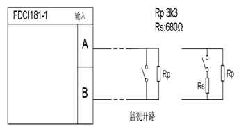 如上圖,AB端引出的兩根線接在被監(jiān)控設(shè)備的干節(jié)點(diǎn)觸點(diǎn)兩端(常開或常閉),電阻Rp接在被監(jiān)控設(shè)備端。顧名思義,監(jiān)控開路就是指當(dāng)A、B兩根線任何一根與被監(jiān)控設(shè)備的連接中斷就會(huì)報(bào)開路故障。這也是為什么Rp接在被監(jiān)控設(shè)備端的目的。如果接在輸入模塊端,那么即使連線出現(xiàn)中斷,也不報(bào)故障,這樣正常的輸入信號(hào)就無法傳遞給輸入模塊,消防主機(jī)也無法報(bào)出事件。