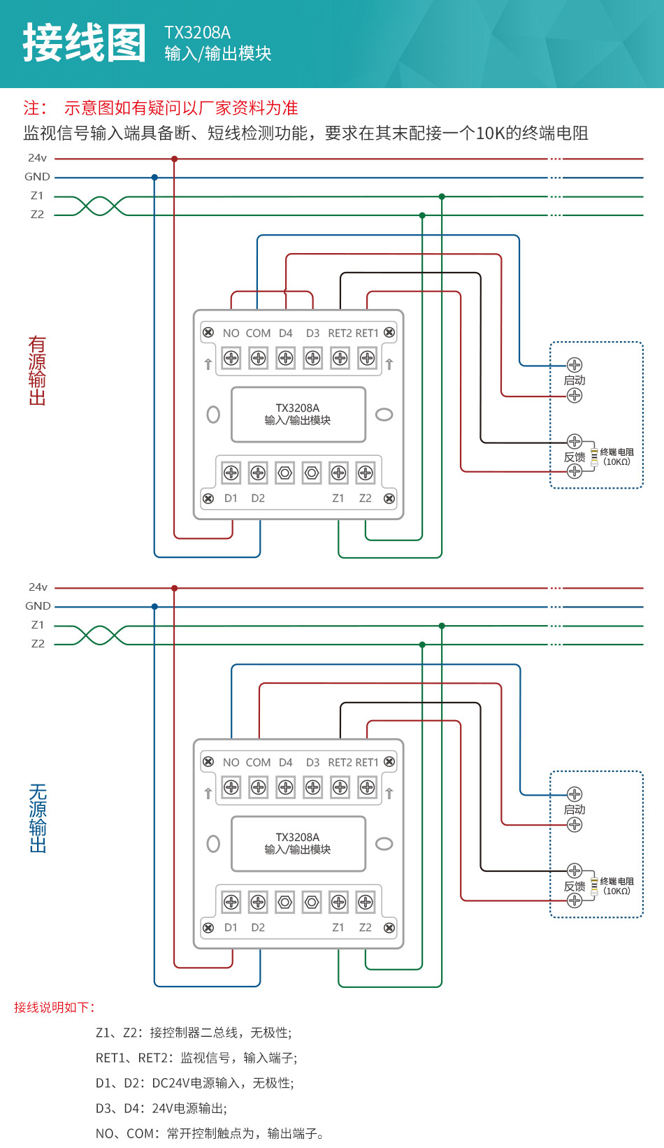 注意:模塊的反饋輸入端具備斷、短線檢測(cè)功能,要求在其末端配接一個(gè)10K的終端電阻,否則控制器將報(bào)出該產(chǎn)品反饋端故障;對(duì)于控制線也具備斷、短線檢測(cè)功能,當(dāng)模塊不動(dòng)作時(shí),要求常開輸出端的電壓在DC12-48V之間,否則控制器將報(bào)出該模塊輸出線故障。